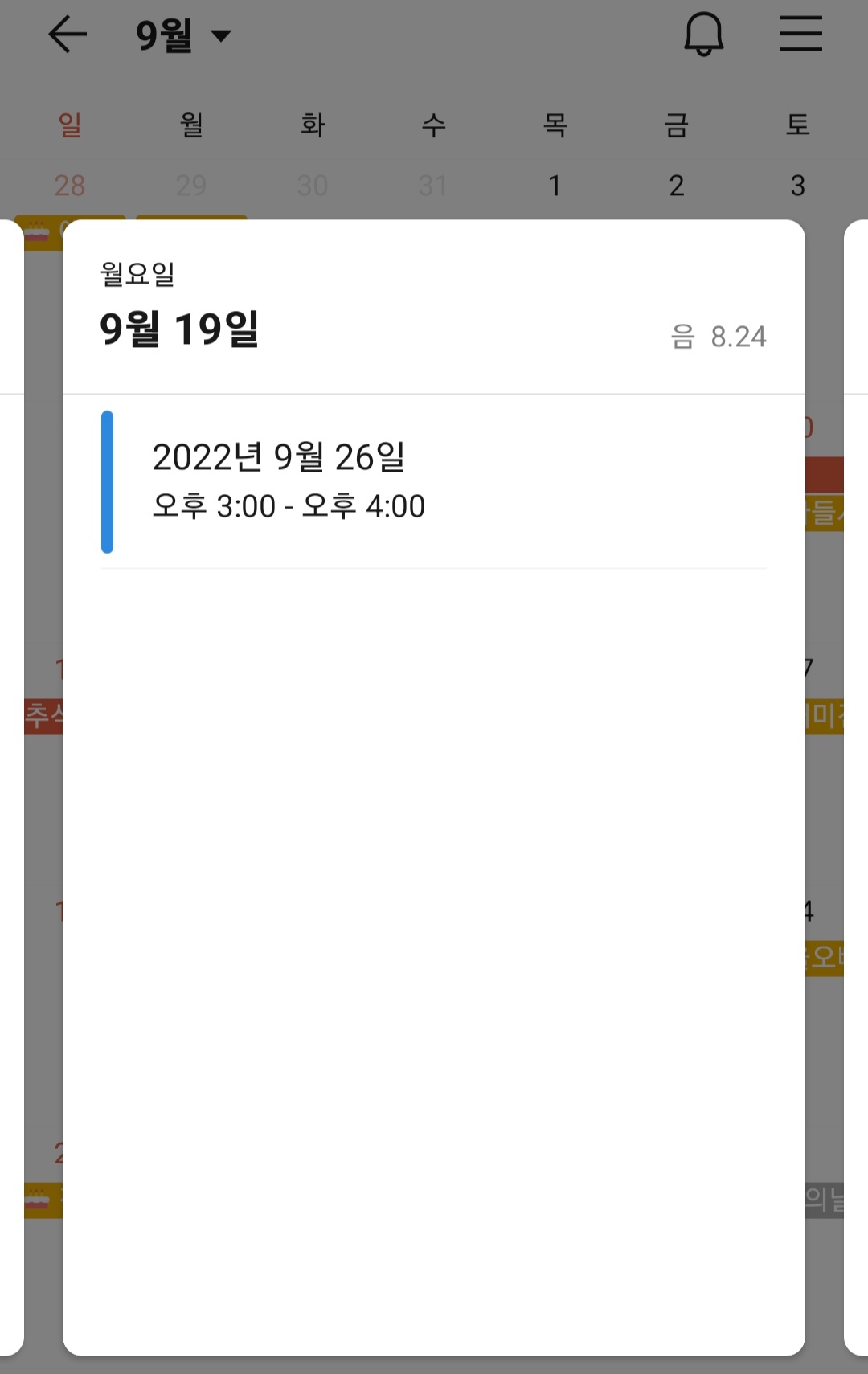 9월 26일 새로운 공부 첫 강의가 있는 날이라 메모장에 메모도 해 놓았지만 캘린더를 알고 난 이후에는 이곳에 날짜 지정을 해 놓으면 핸드폰은 항상 손에 지니고 다니다 보니 알람이 오면 바로 확인 가능해서 좋습니다