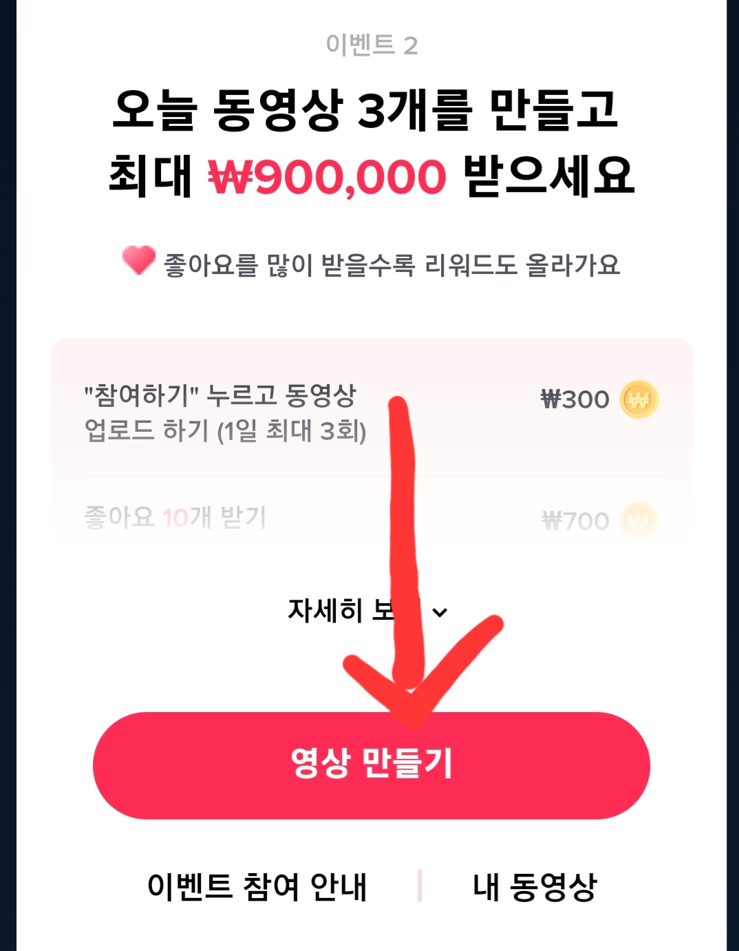 리워드 받을 수 있는 개수는 하루에 3개까지 입니다 동영상 1개당 300원을 주고 좋아요 10개가 클릭이 되면 개당 700원을 주니 하루 수익이 3,000원 그리고 좋아요 400개면 1개당 만원의 수익이 들어오게 되어 있고 최대 하루 900,000원까지 가능합니다 틱톡 동영상 업로드 3개로 하루 구십만 원 수익이 창출되니 신기합니다