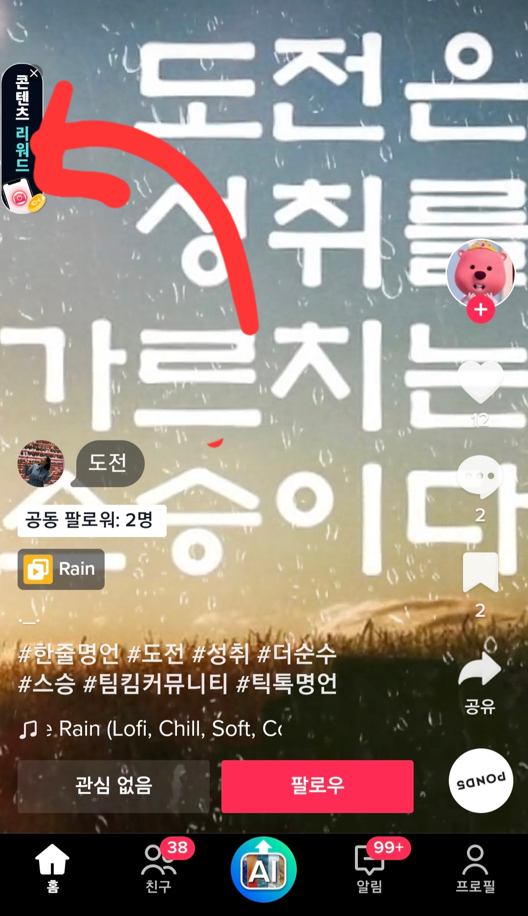 동영상을 업로드하려면 일단 짧게 5초에서 10초 정도 찍으면 되고 동영상이 준비되어 있다면 콘텐츠 리워드 클릭하시면 되는데 어렵게 생각하지 마시고 그냥 클릭하면 됩니다 홈을 클릭하면 메인 화면으로 되돌아가고 내가 올린 동영상을 친구에게도 보내고 싶다면 바로 클릭 두 번이면 다 보내지게 되어있습니다 프로필은 그동안 내가 올린 영상들을 한 번에 볼 수 있으니 좋고 인스타 릴스와 거의 비슷하답니다