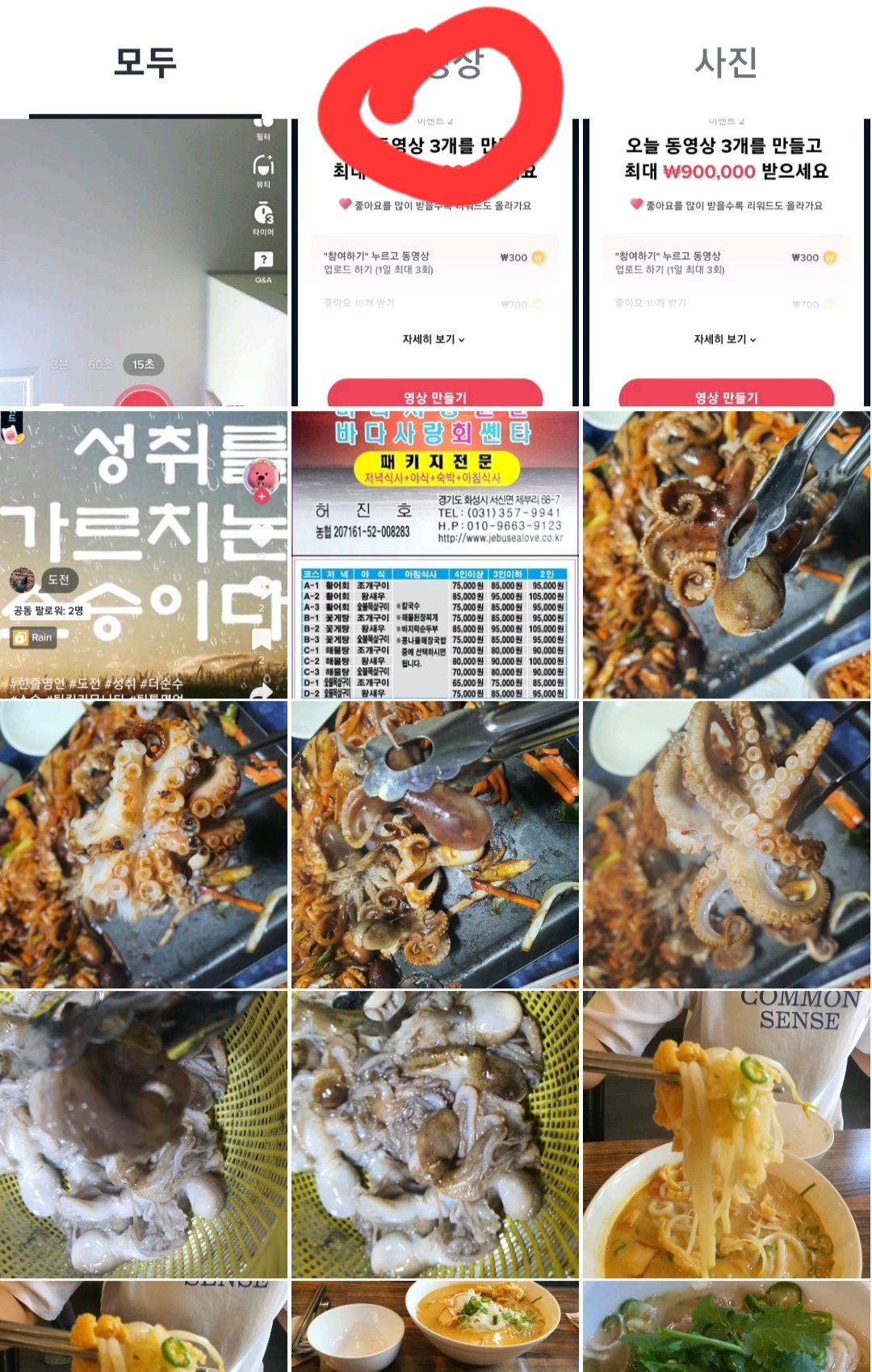 동영상 만들기 클릭하면 편집 효과, 업로드 중 업로드를 클릭 후 맨 위 중앙에 동영상을 클릭하면 내가 찍어 놓은 영상들이 보이게 되는데 올리고 싶은 영상을 클릭하시고 난 후 해시태그 입력하시면 됩니다