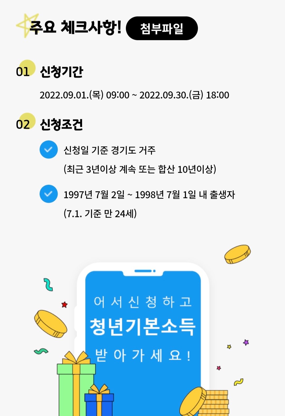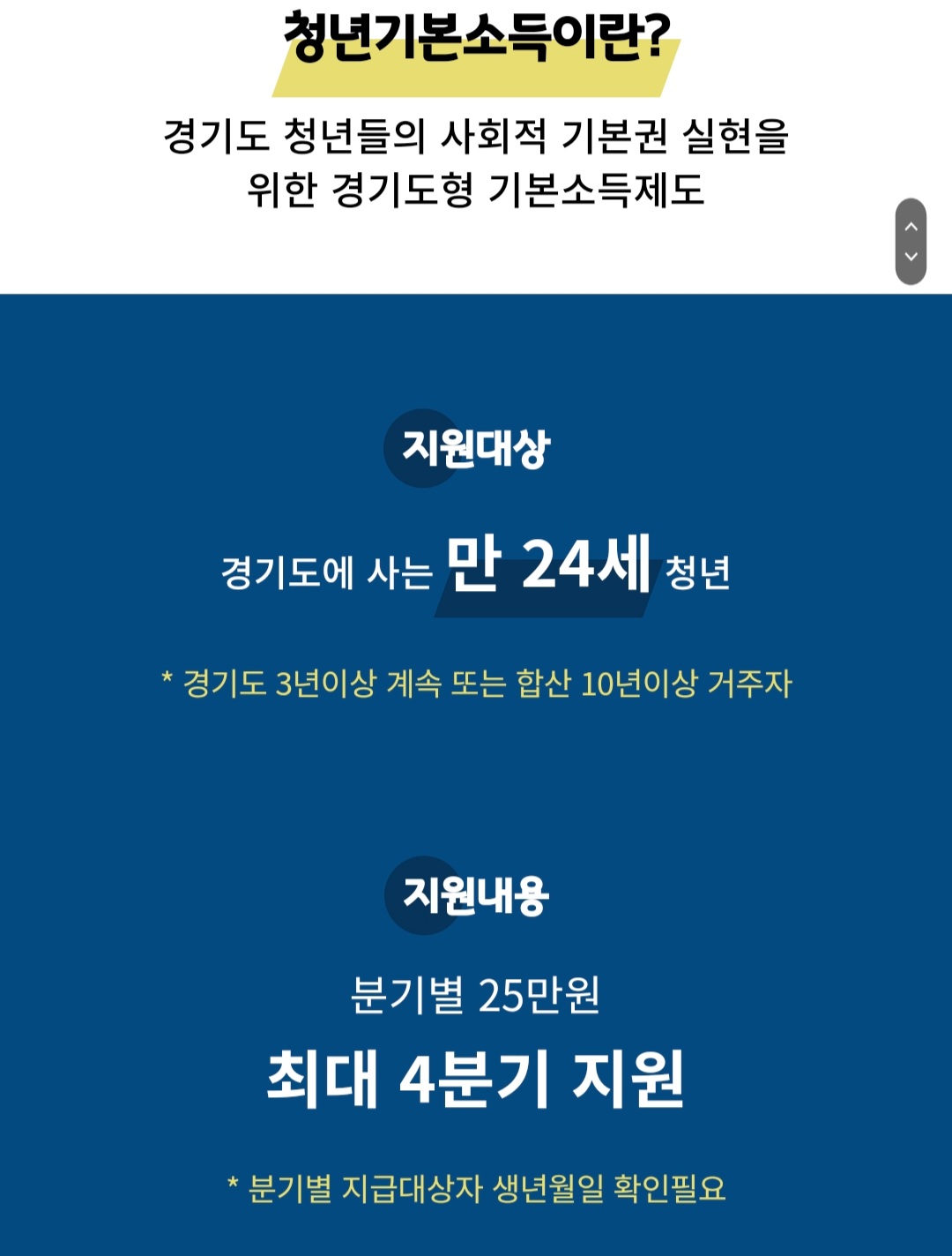 대상자 - 경기도에 사는 만 24세 청년 경기도에서 3년 이상 또는 합상 10년 이상 거주자