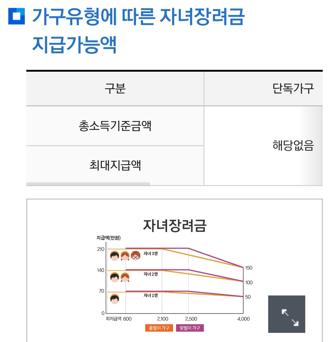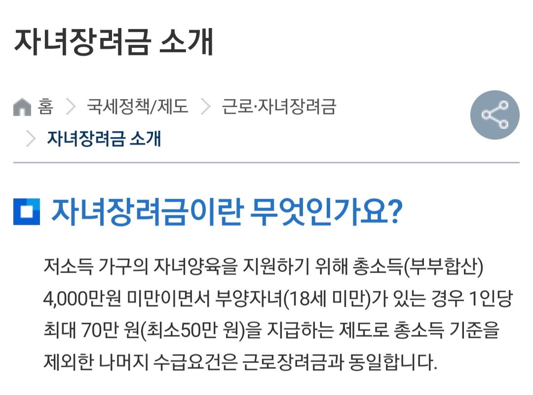 저소득 가구와 자녀양육을 지원하기 위해 총소득 (부부합산) 4,000만 원 미만이면서 부양자녀 918세 미만)가 있는 경우 1인당 최대 70만 원(최소 50만 원)을 지급하는 제도를 총소득 기준을 제외한 나머지 스급요건은 근로 장녀금과 동일합니다